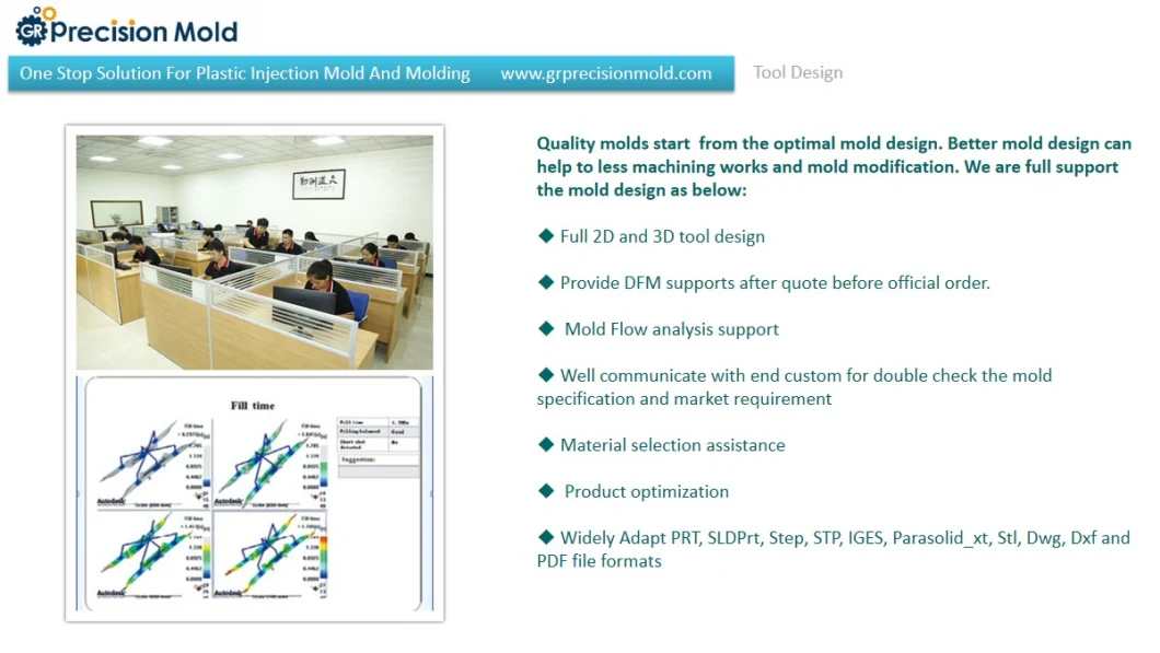 About GR MoldEstablished in 2002. GR Precision Mold - a leading supplier of precision molds and tooling parts, as well as turnkey solution, offering professional services for automotive, household,electronics, packaging industries, as well as the plastic parts of industrial tools and equipments.Plastic Injection Mold &